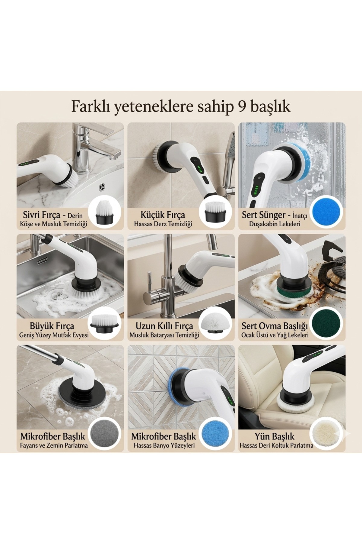 Bu set, evinizin her yüzeyi için özel olarak tasarlanmış 9 farklı fırça ve sünger başlığı içerir. Başlıkları tek bir hareketle kolayca değiştirebilirsiniz.