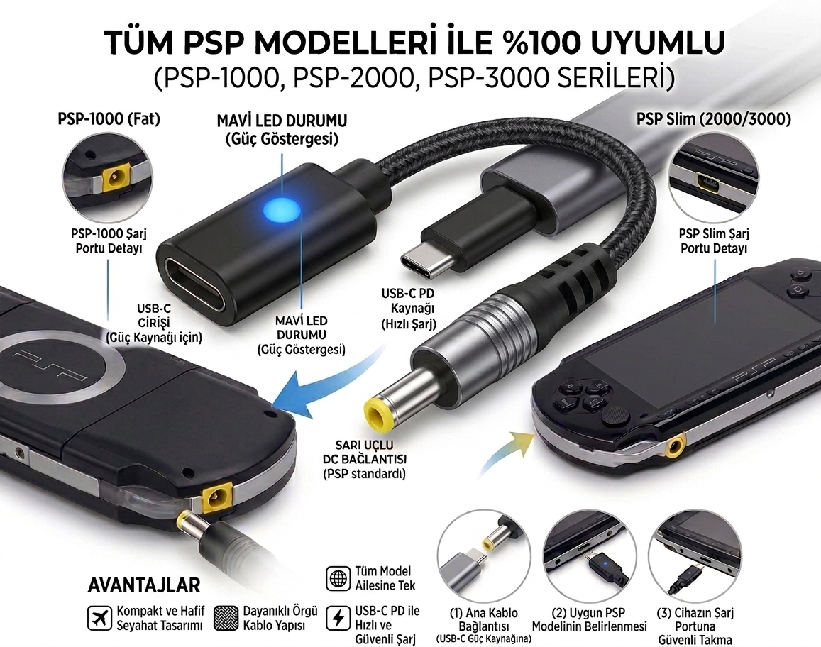 PSP KONSOLLARINIZI HERHANGİ BİR TYPE-C ŞARJ KABLOSU İLE ŞARJ ETMENİZE OLANAK SAĞLAR