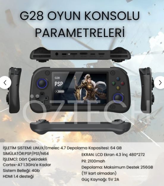 G28 Taşınabilir Retro Oyun Konsolu, 4.3 inç HD IPS ekranı, güçlü donanımı ve 15.000’den fazla yüklü oyun arşiviyle sizi zamanda keyifli bir yolculuğa çıkarıyor. PSP, PS1, NES, SNES, GBA ve MAME emülatör desteği sayesinde unutulmaz retro oyunları her an her yerde oynayabilirsiniz.