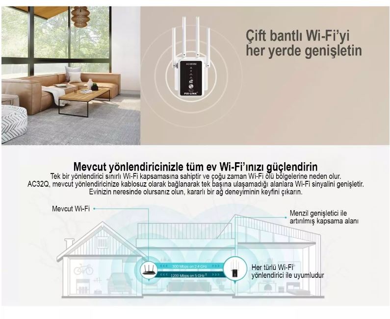 AC1200 Dual Band WiFi sinyal güçlendirici modelidir. Ev, ofis ve iş yerlerinde
